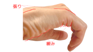 また、指を曲げると下の写真のように、張る部分と緩む部分ができます。